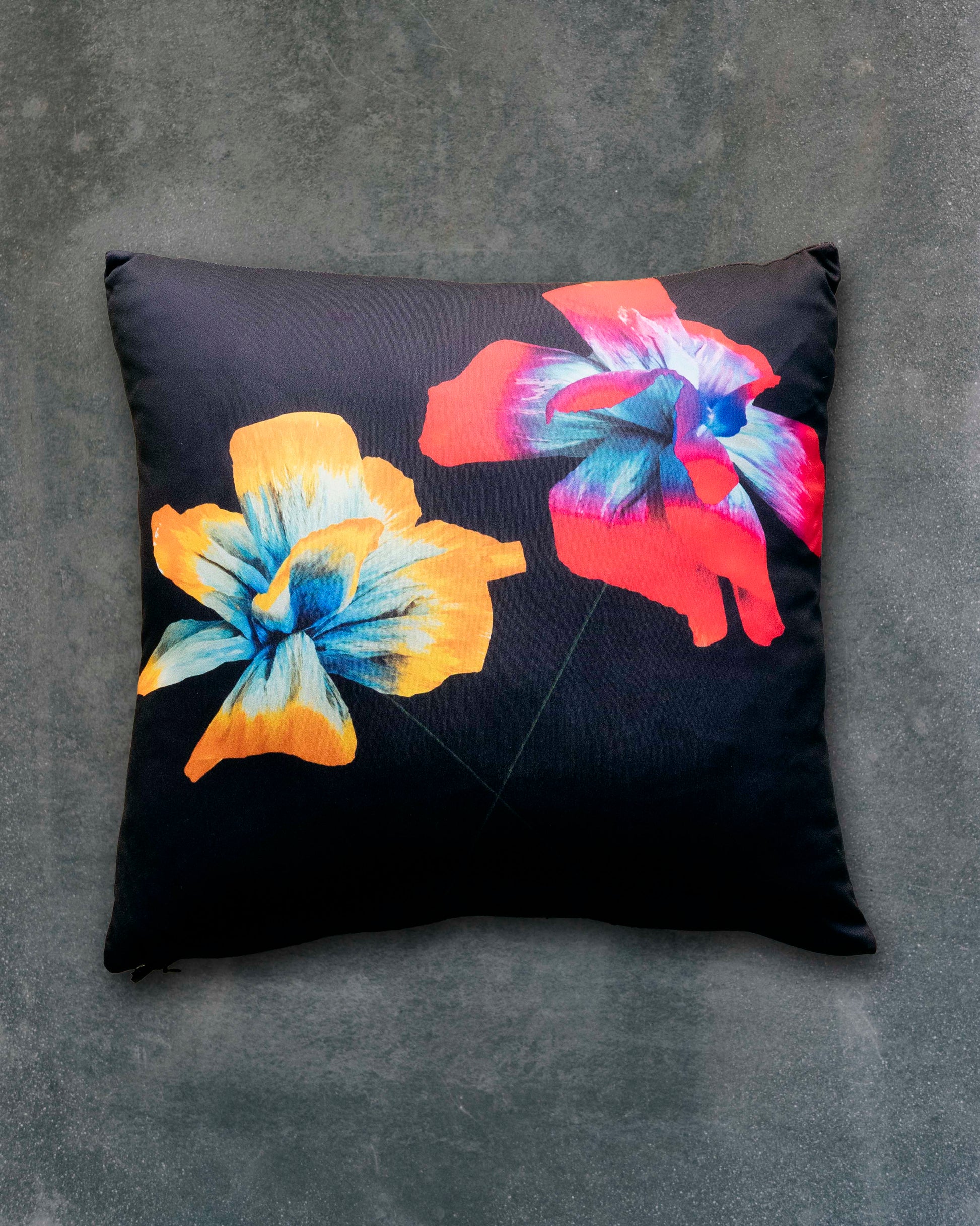 Cuscino nero con stampa policroma su poliestere, dimensioni 40x40
